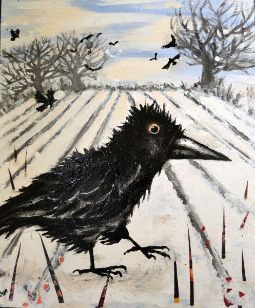 Painting by Sue Ollerenshaw - The classic crow, with all black feathers that sometimes look glossy. They can be found almost anywhere and are usually seen alone or in pairs. They have a croaky call that they often give three or four times — "Caww! Caww! Caww!".